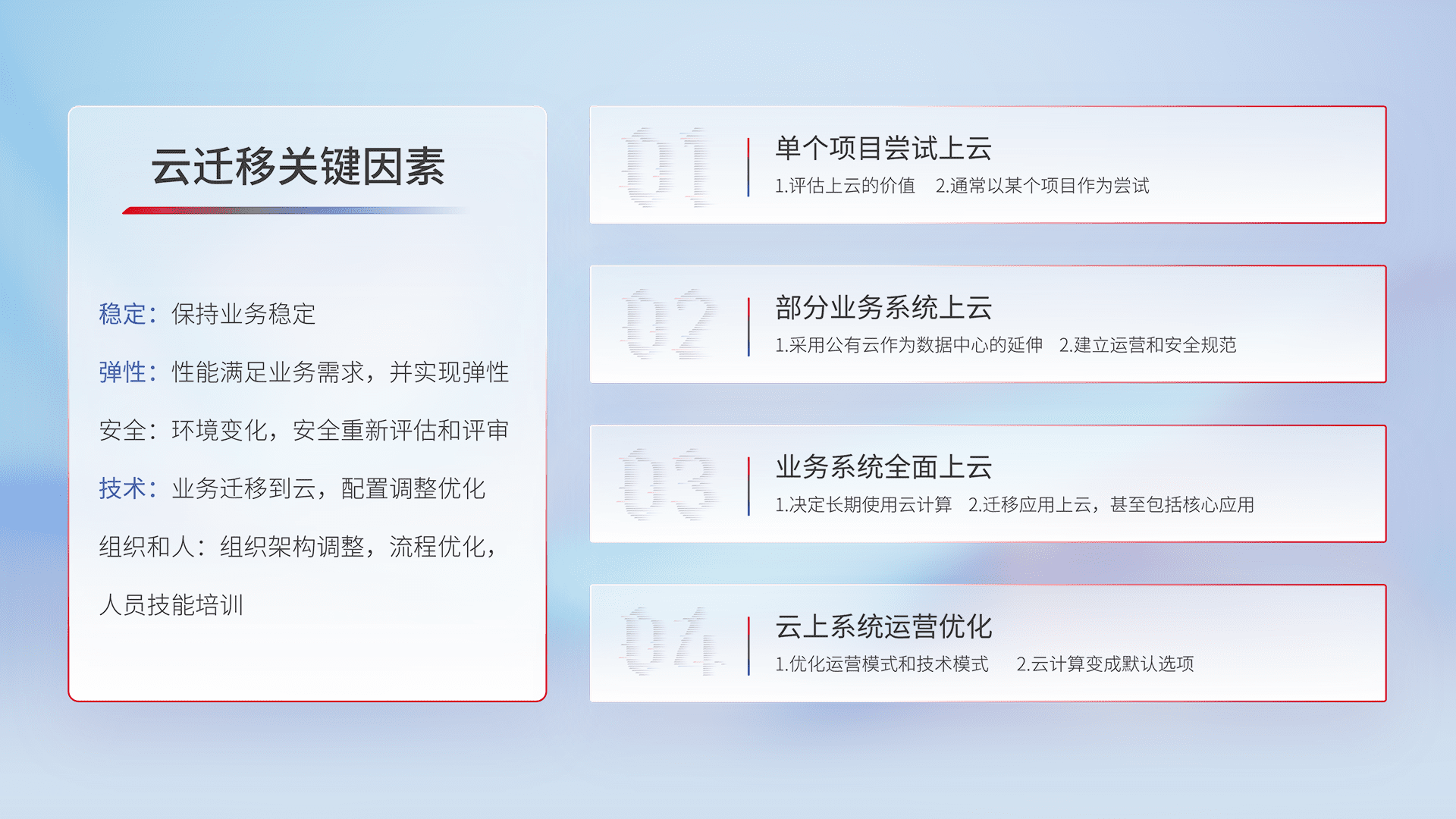 结合实际业务,,,从规划设计、、云平台选型、、、云原生改造、、、数据迁移、、集成交付,,迁移全过程为客户识别最佳上云路径,,,做好风险识别管理,,设计网络架构、、、身份权限、、安全审计合规、、、、操作审计、、、、日志审计、、监控告警策略、、多站点容灾设计等,,,对云上基础设施进行整体规划,,,,提升IT治理水平,,以满足弹性、、高可用、、高性能的需求。。
