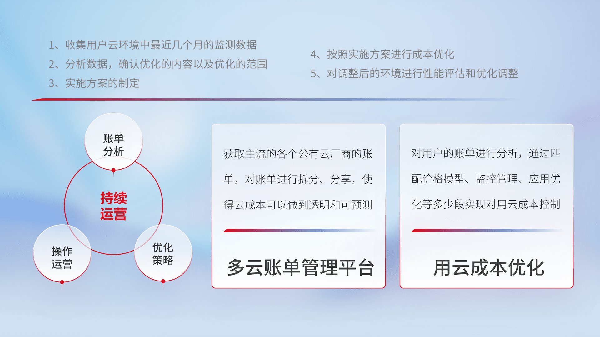 通过多云纳管,,,以统一的资源数据模型把客户的云资源进行抽象和封装,,,,进而实现对多云资源的统一操作,,,,保障云资源管理的可靠性、、稳定性与可用性。。。量身定制化运维内容,,,,配置、、、开发运维、、、补丁管理、、、备份、、、、监控、、认证和访问管理、、审计和日常巡检等,,,,保障在用云过程中的可靠度,,,,稳定度以及高可用率。。。。